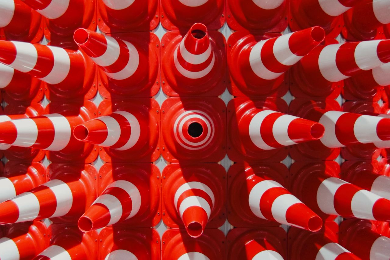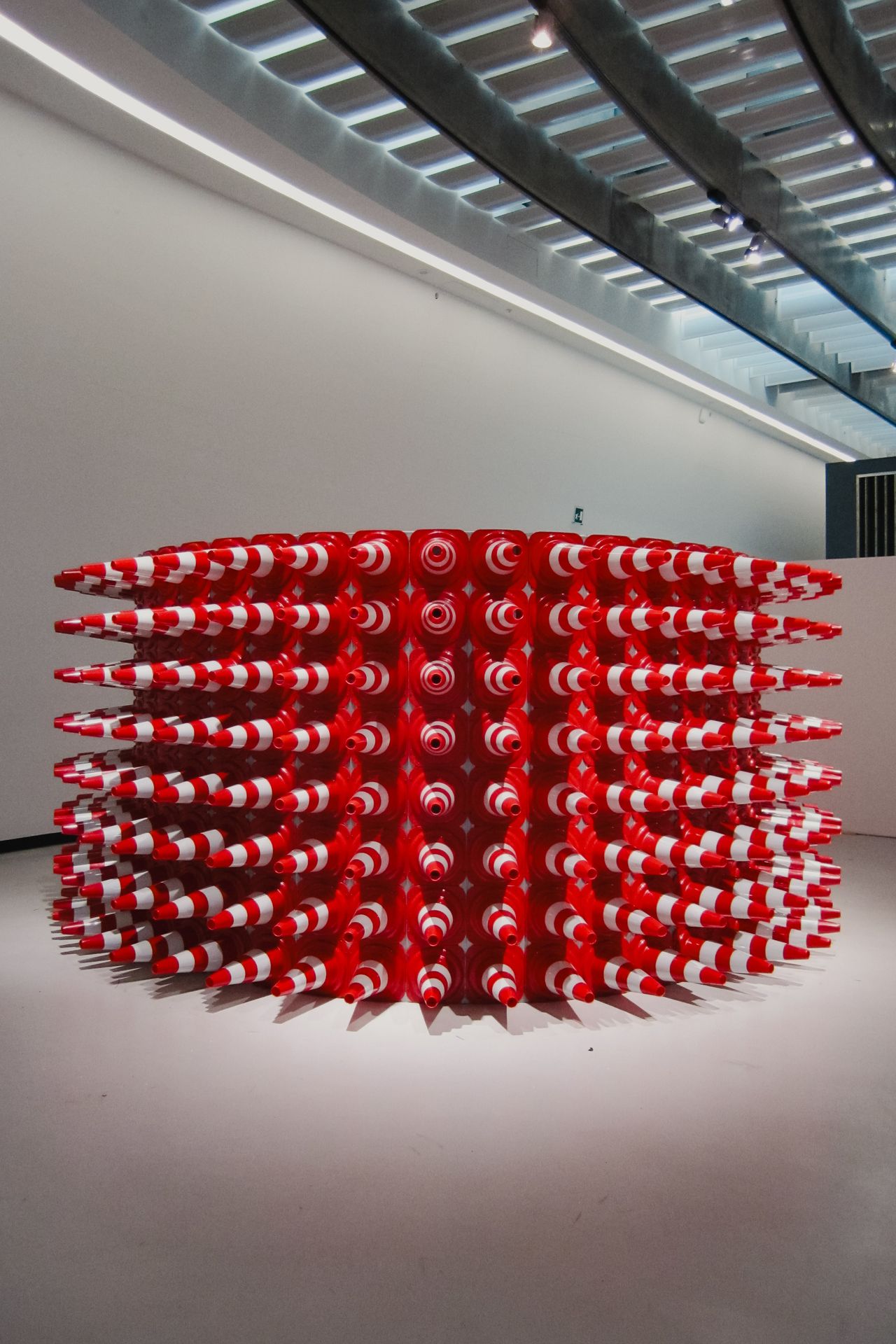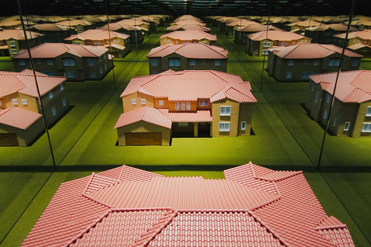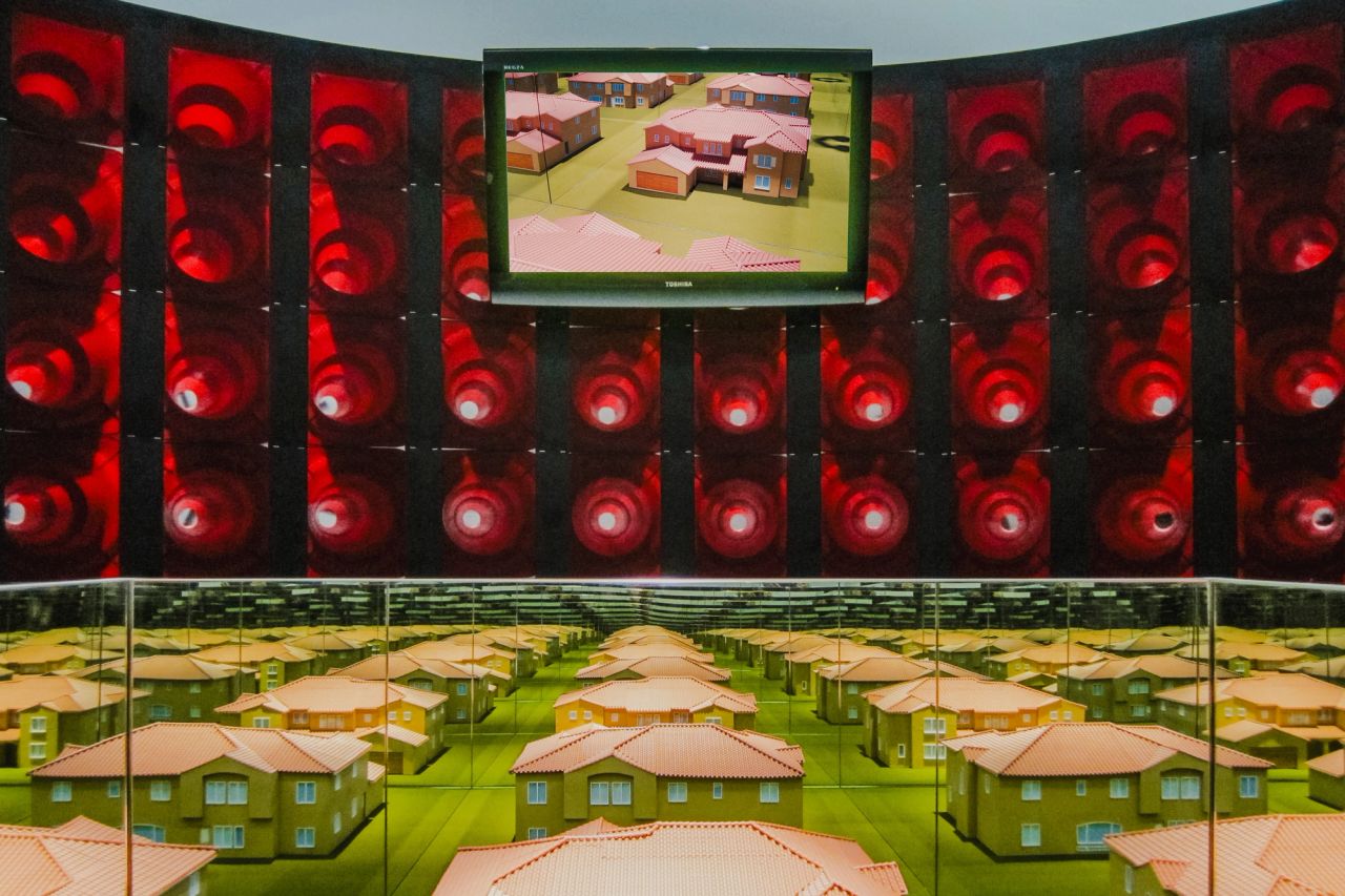 Cultural Traffic: From the Global Border to the Border Neighbourhood consisted of a cylindrical pavilion comprised of traffic cones, hosting three video animations and the McMansion Retrofitted model: a scale reproduction of a typical villa in Southern California whose image is multiplied in the mirrors surrounding it. Here, we reflected on the dynamics of urban conflicts generated in border territories such as San Diego and Tijuana. What inspired this project was the relationship between these two cities, where immigrants who move northward begin to alter the urban homogeneity of Southern California, to the same degree that San Diego recycles its urban waste in the poorest neighborhoods of Tijuana.