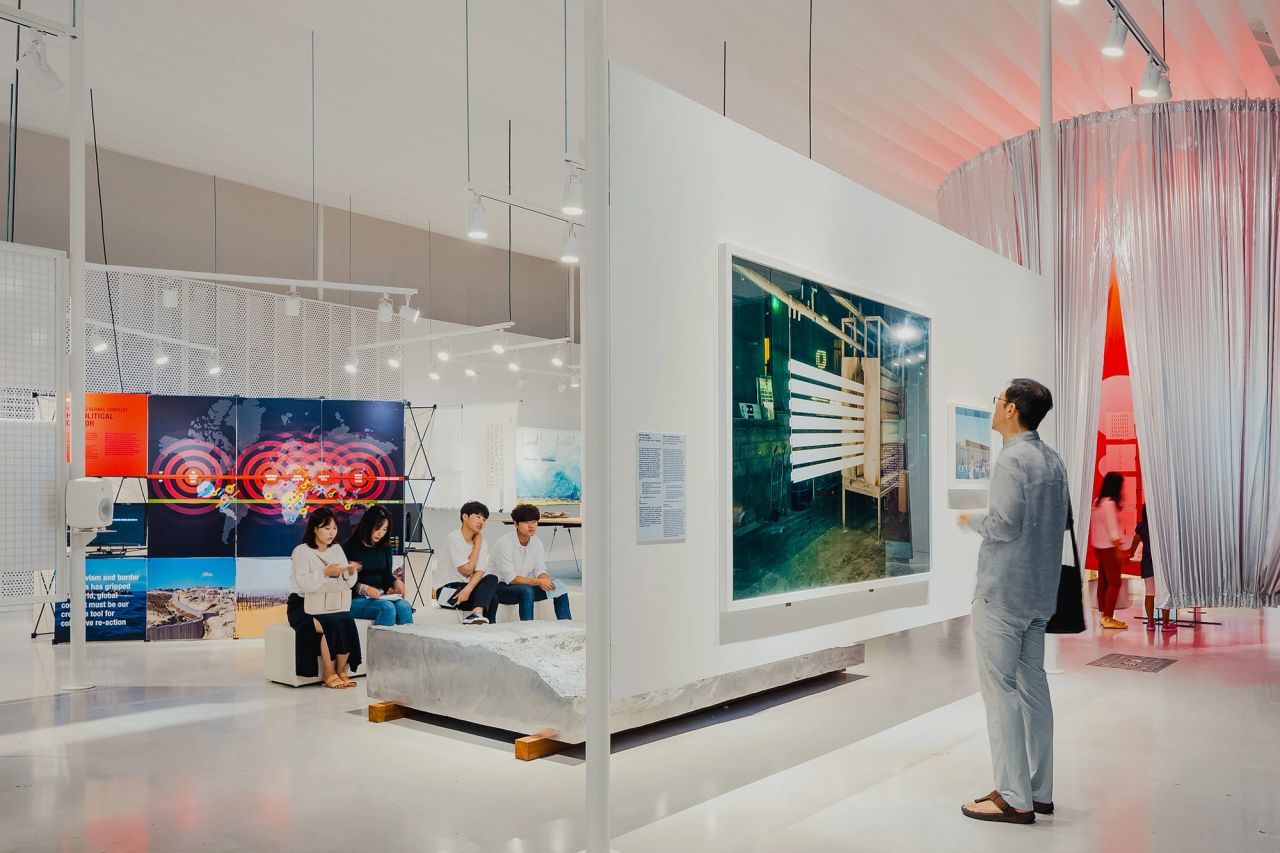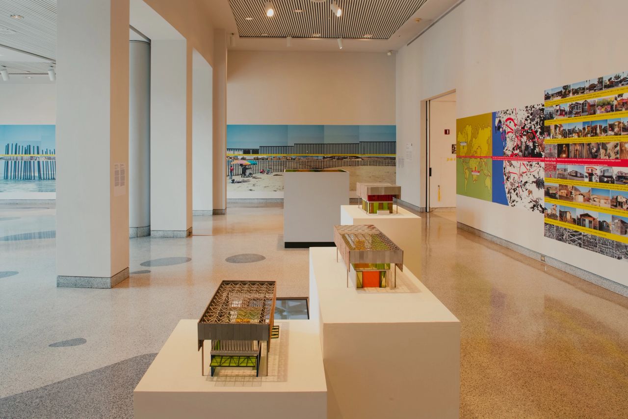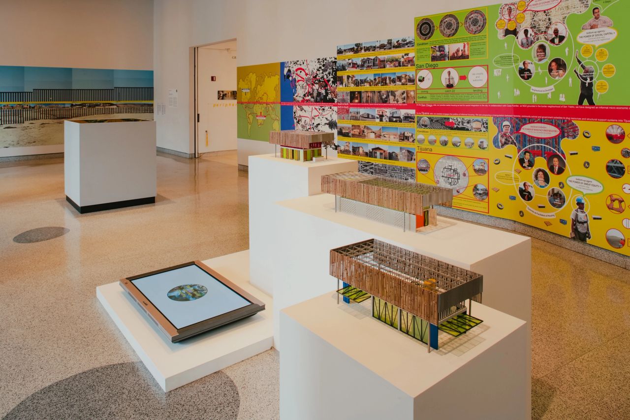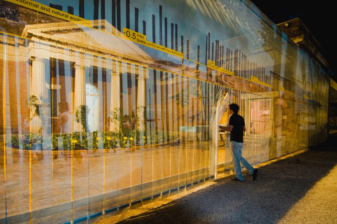 MIX: Teddy Cruz addressed the US–Mexican transborder urban dynamics, the social and political implications of migration, architecture and development, and conflicts such as those between privatization and public space, between military bases and environmental zones, and between the natural and political boundaries. In Radicalizing the Local: 60 Miles of Trans-Border Urban Conflict, a large, horizontal photo mural presented a 60-linear-mile cross-section of images beginning 30 miles north of the international border between the United States and Mexico at the San Diego–Tijuana checkpoint—the most trafficked international border in the world—and stretching 30 miles south of the border into Tijuana.