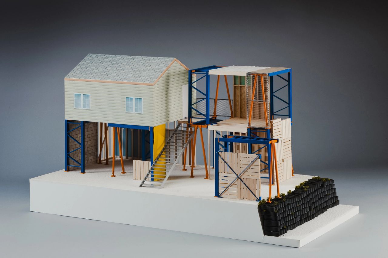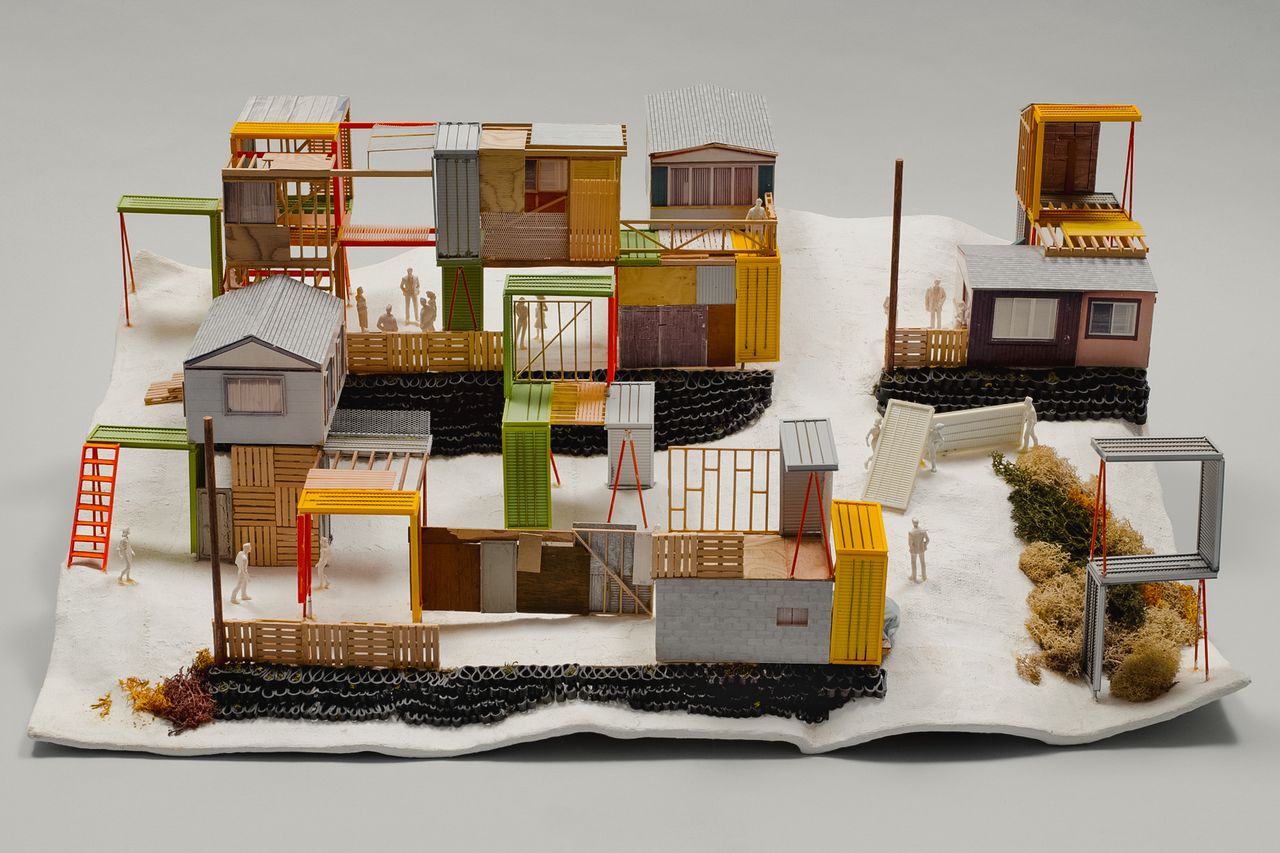Manufactured Sites: A Housing Urbanism Made of Waste presented the result of a decade of research into the border between the wealthy sprawl of suburban San Diego, California, and the ad hoc, scrappy shantytowns of Tijuana, Mexico. The exhibition displayed a 3D model of a scaffolding system that would allow Tijuana to achieve a greater level of density, an essential quality to maintaining order in an urban setting already approaching entropy. The scaffolding functions as a frame upon which milk crates, tires, sheets of corrugated metal, rammed earth, and cinder blocks can be arranged, with a particular emphasis on vertical development. The simple, modular, and rapidly deployable scaffolding system allows users to complete the remaining design according to their preferences and needs.